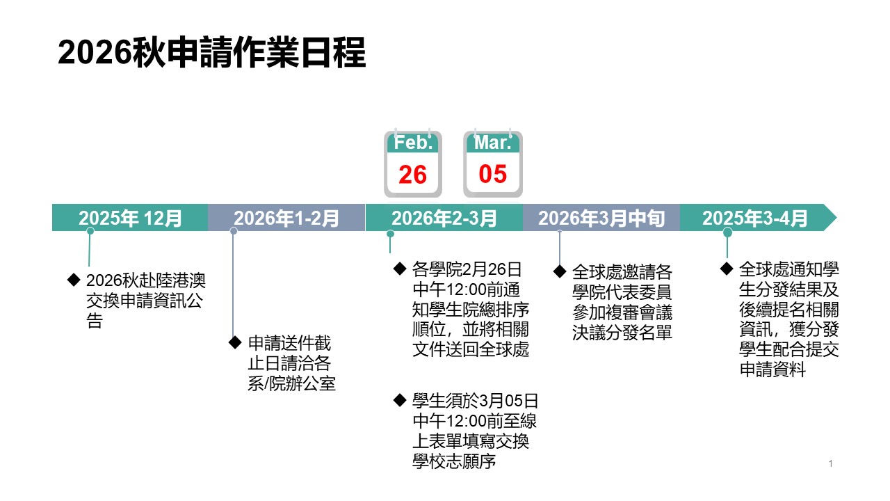 2025年12月12日起至2026年02月26日止開放申請,請逕洽所屬院系報名截止日。