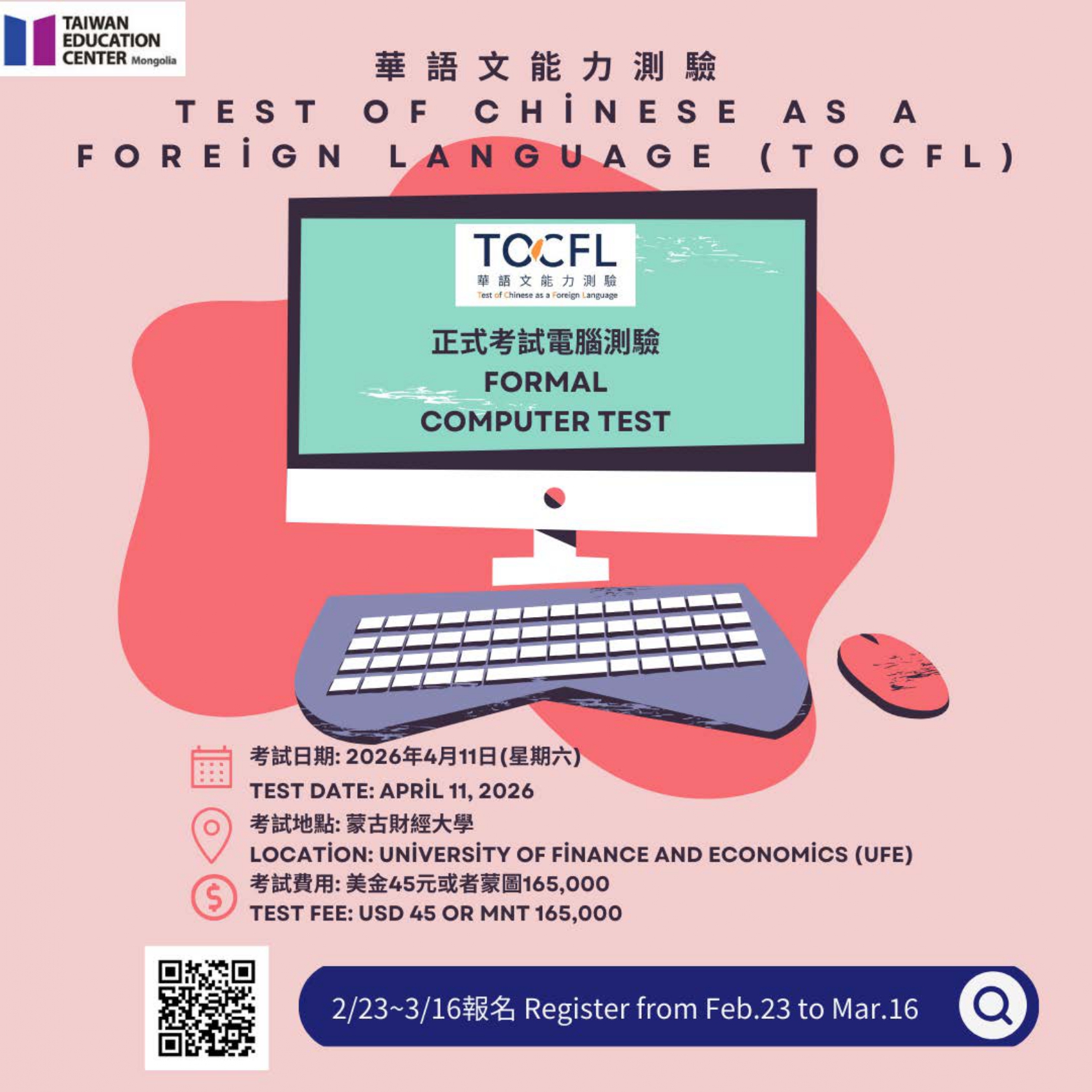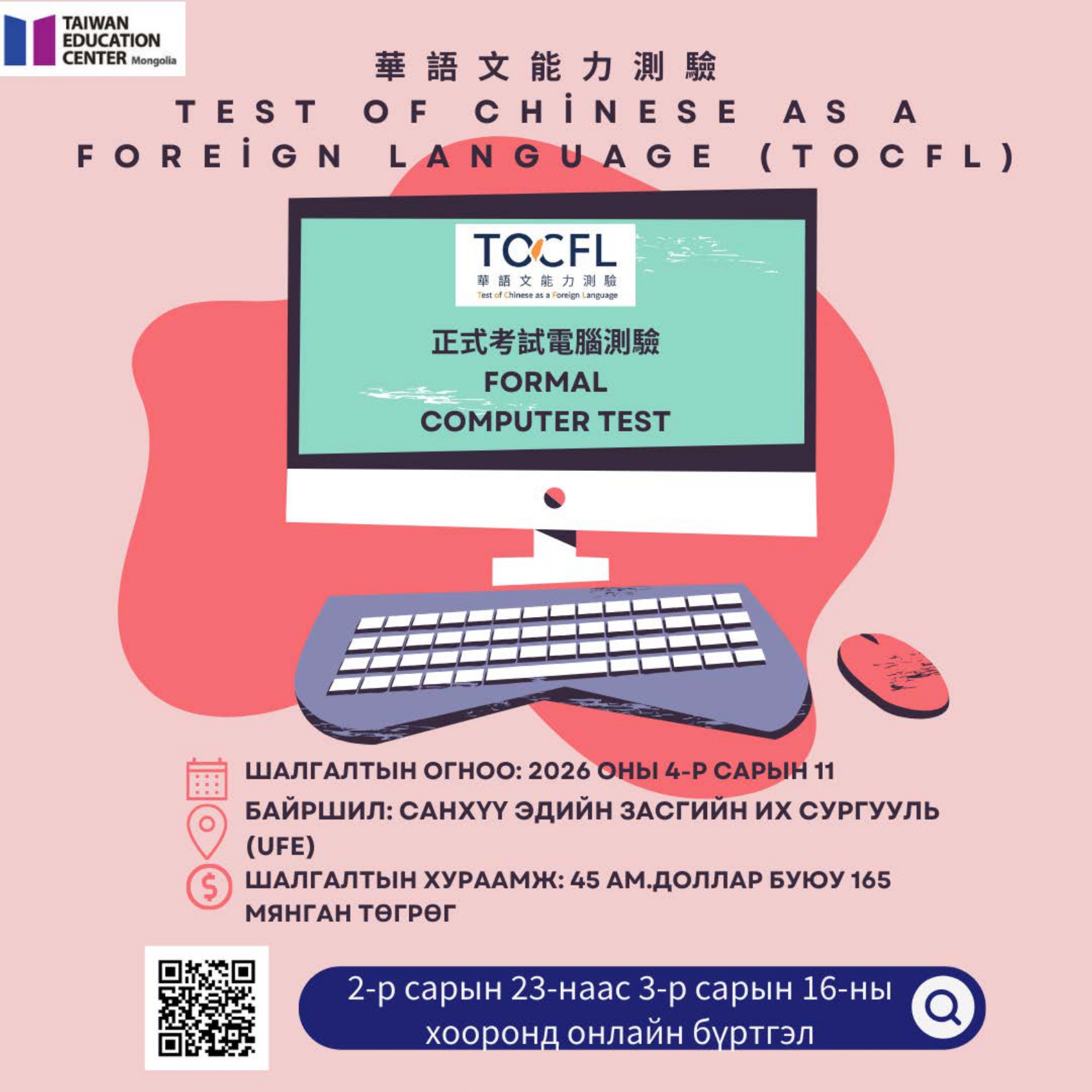 【轉知】蒙古臺灣教育中心辦理2026年「華語文能力測驗」正式考試相關事宜