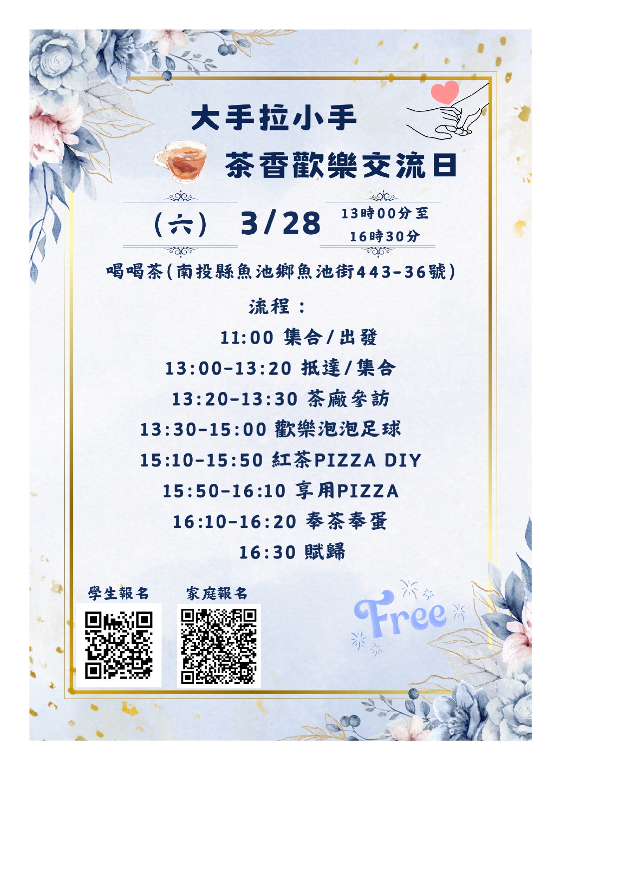 教育部「大專校院境外學生輔導人員支援體系計畫(NISA)辦公室」將於3月28日舉辦接待家庭文化交流活動,邀請境外學生與接待家庭一同前往南投,透過導覽與手作體驗,共度一個充滿茶香與人情味的午後時光!